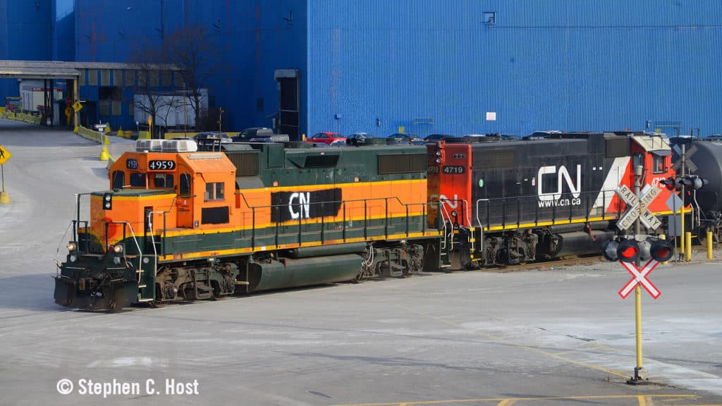 While CN regularly acquires six-axle locomotives for main line power and has units rebuilt and repowered for modernization programs, purchase of four-axle switching locomotives is sporadic at best. In 2024, 13 BNSF GP38-2 and GP39-2 units were on horsepower-hour-based loans to CN, and by the end of the year CN exercised an option to purchase several of them. The first purchased and “patched” locomotive, now numbered CN 4959 (former BNSF 2316) is in service. It’s pictured in Hamilton, Ontario on Jan. 21, 2025.