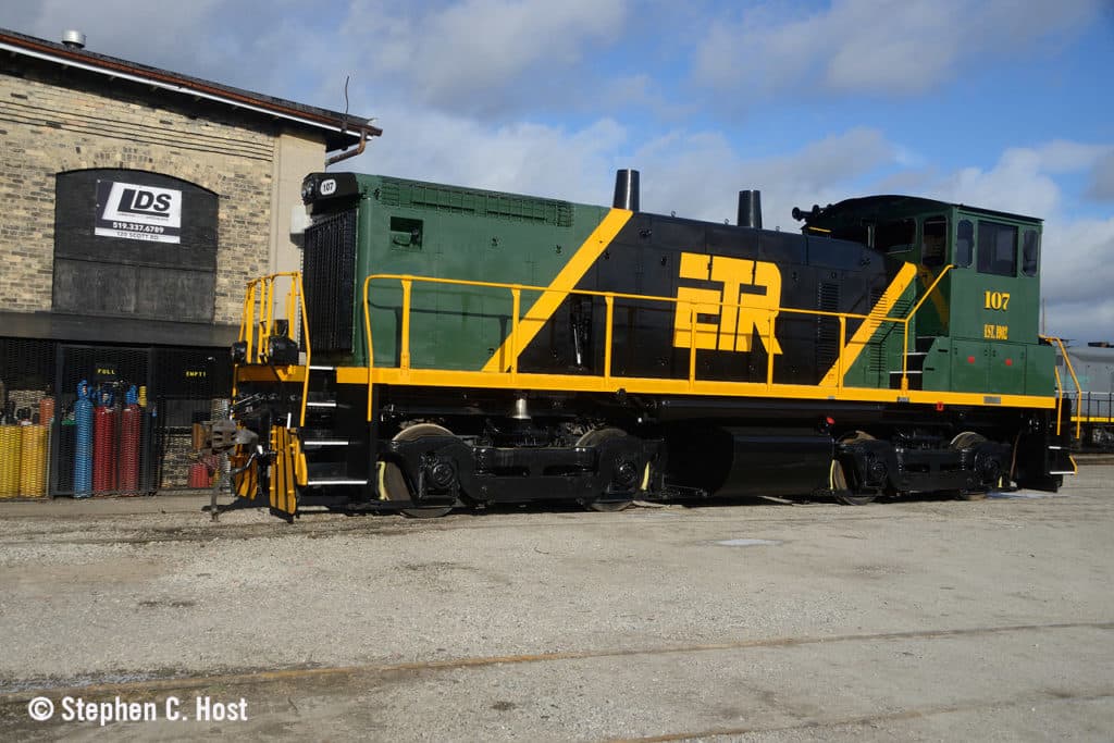 Independently owned and operated Essex Terminal Railway (ETR), one of the oldest short lines in Canada (est. 1902), has painted one of its locomotives in a new scheme. ETR staff developed this scheme, which incorporates the green, yellow and black that have been used on its locomotives since the railway bought its first diesels during World War II. No. 107 is pictured at the Lambton Diesel Specialists shop in Sarnia, where the locomotive was painted after repairs were completed. The Essex Terminal operates about 34 miles of track, handling about 15,000 cars a year interchanging with CN, CPKC and CSX.