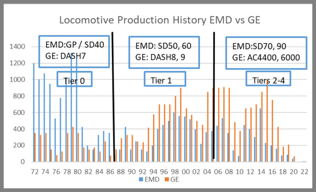 The 23-year-old mandate by 2030 as outlined by CARB coincides with the imposition of Tier 2 requirements in 2005. In other words, no locomotive will be able to operate in California without complying with Tier 2 beyond 2030, but ultimately banned by 2035 if the regulation holds. Since 2005, there have been more than 15,000 locomotives delivered meeting Tier 2, the majority GE/Wabtec.