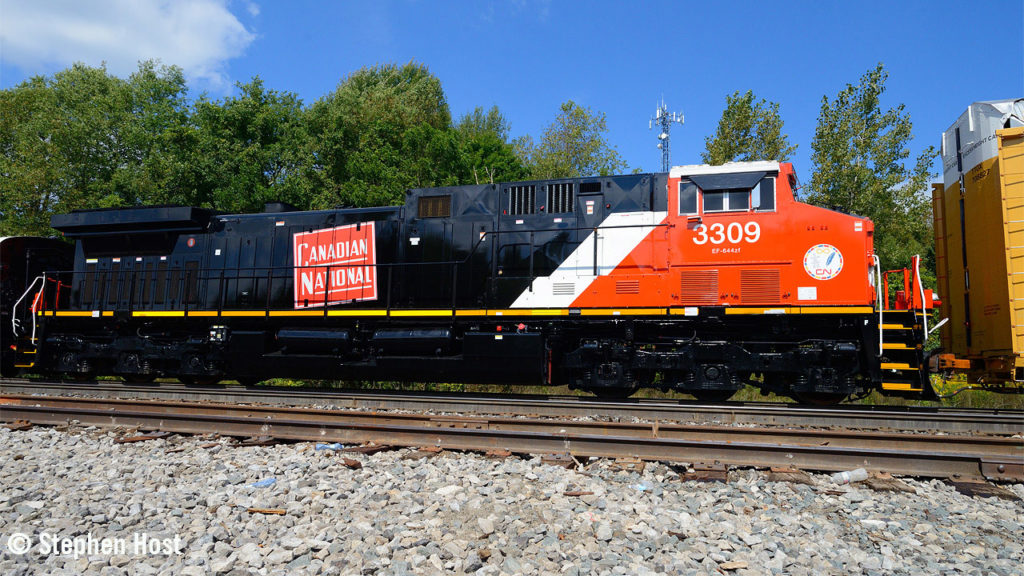 CN 3309, a Wabtec AC44C6M rebuild upgraded to AC traction and 4, 500 hp in 2022 from DC-traction Dash-9 2598 built in 1998, has been assigned to CN’s Executive Train for the past few months. President and CEO Tracy Robinson and her team made a trip from Montreal to Eastern Canada in August 2023. After the trip, the Executive Train returned to the shop for some special preparations. Emerging last week, 3309 sported a major carbody change, with the red and white Canadian National emblem as it was introduced by the company in 1923.
