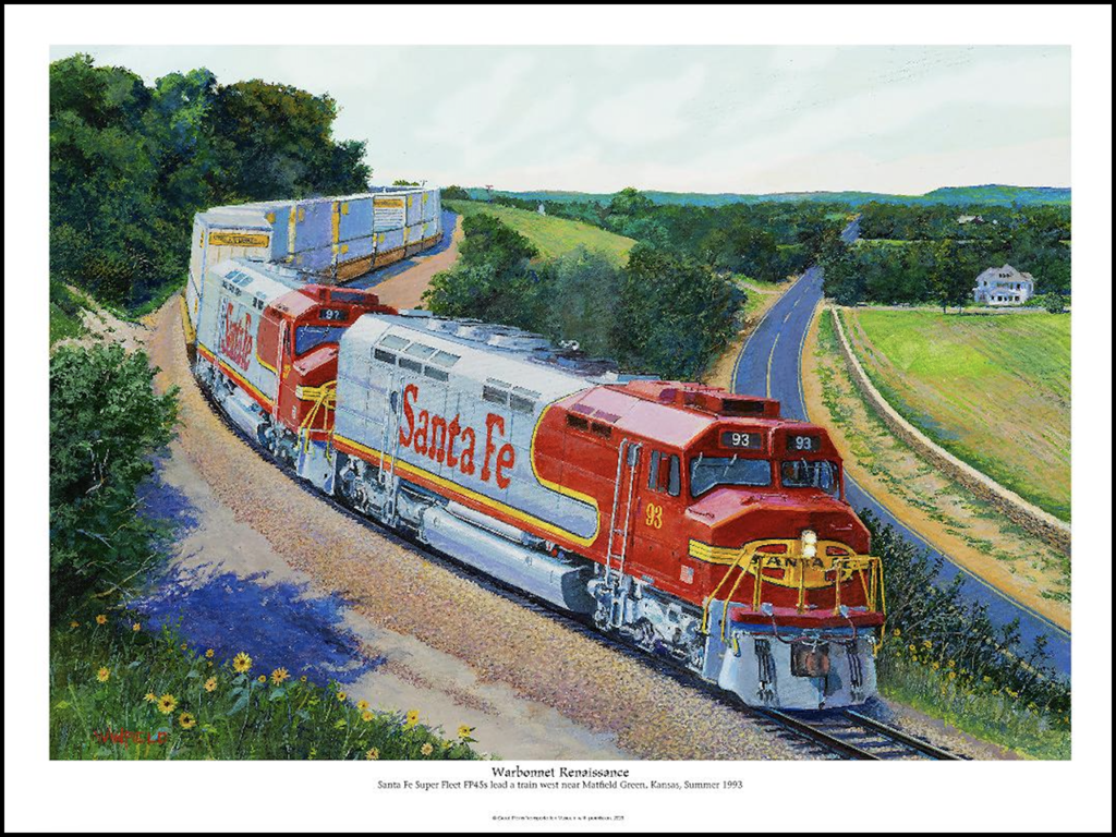Wichita, Kans.-based Great Plains Transportation Museum is now selling lithograph and canvas giclee prints of John Winfield’s “Warbonnet Renaissance” to aid in its effort to cosmetically restore Santa Fe Railway diesel-electric locomotive No. 93, which was built by the Electro-Motive Division (EMD) of General Motors Corporation in late 1967 and donated by BNSF in June 1999.
