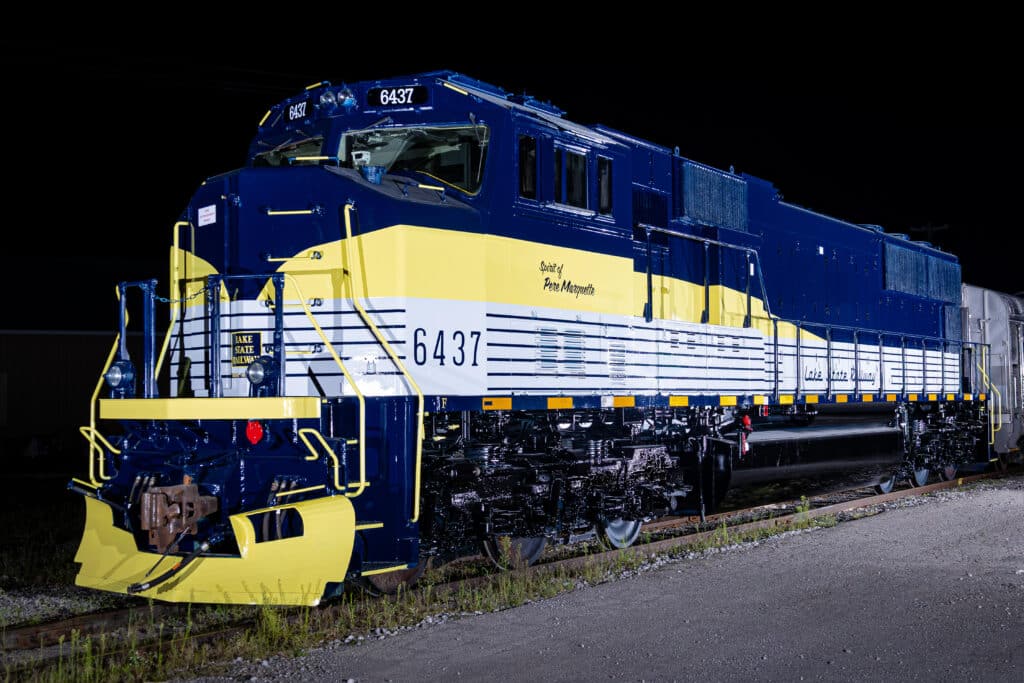 Redone at LSRC’s Saginaw shops, No. 6437, a former Union Pacific SD70M, was rechristened “Spirit of Pere Marquette” with a tribute livery conceived by second-generation LSRC railroader Travis Vongrey, former conductor, engineer, yardmaster and now supervisor of yard operations. Vongrey’s concept art was based on E7 locomotives that pulled the Pere Marquettes, streamlined passenger trains that made daily trips serving Detroit, Lansing and Grand Rapids. Vongrey’s designs were given to LSRC consultants who developed technical specifications based on historical research. Southern Pride Equipment Painting of Sharpsburg, Ga., performed the painting and detailing.