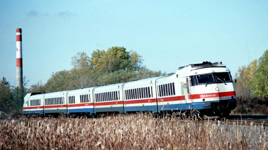 An RTL Turboliner trainset near the Baird Road crossing in East Rochester, N.Y.. In the early 1970,s New York State put up money for higher-speed rail service between New York City and Buffalo. Some of those funds went to purchase these turbine trainsets, some to upgrade sections of track for 110 mph operation. These trainsets were built by California’s Rohr Industries, based on the RTG French design already in use on some Midwest routes. Wikimedia Commons/Bruce Fingerhood