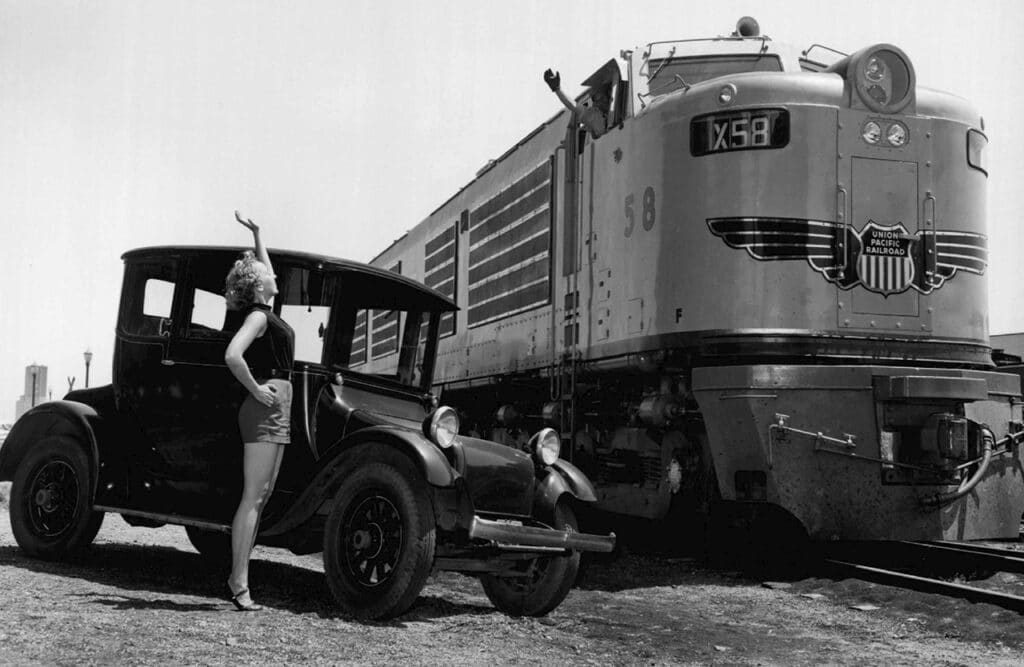 Publicity photo of a first-generation Union Pacific GTEL locomotive and a circa-1923 electric auto in Fremont, Neb. The auto was owned by a local woman and the locomotive was on its way west to haul freight between Wyoming and Utah. Wikimedia Commons/Union Pacific