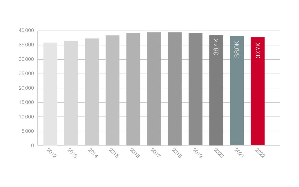The long-term trend of new locomotives being added to the North American fleet paused in 2018, when the locomotive fleet decreased by three units and that decline continued in 2022. Last year, the locomotive fleet decreased by 284 units to 37,704 units, for a growth rate of –0.8%, up from the previous year’s growth rate of –1.0% (see Figure 1).