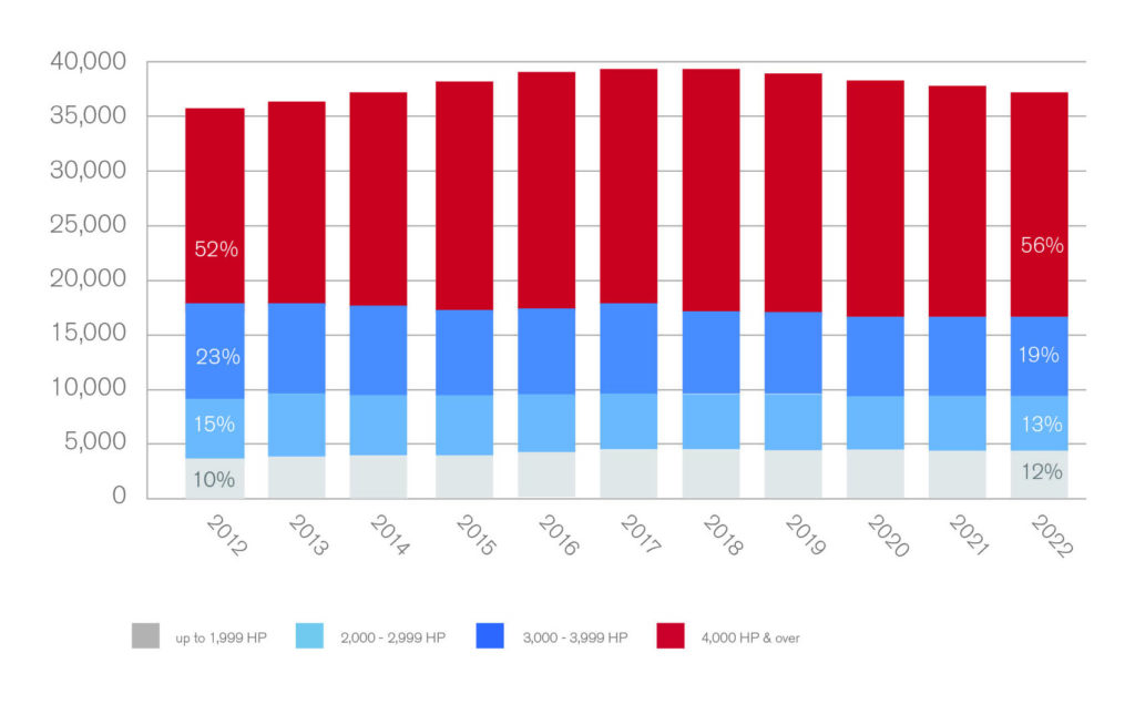 Locomotives between 2,000 and 3,999 horsepower comprised 32% in 2022, down from 38% in 2012.