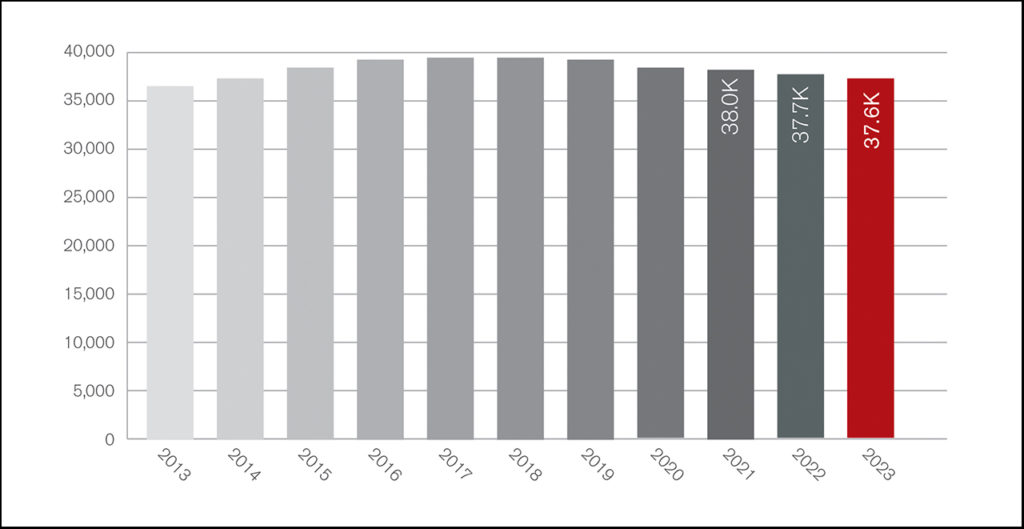 The long-term trend of new locomotives being added to the North American fleet paused in 2018 when the locomotive fleet decreased by three units, and that decline continued in 2023. Last year, the locomotive fleet decreased by 145 units to 37,559 units, for a growth rate of -0.4%, up from the previous year’s growth rate of -0.8% (see Figure 1, below).
