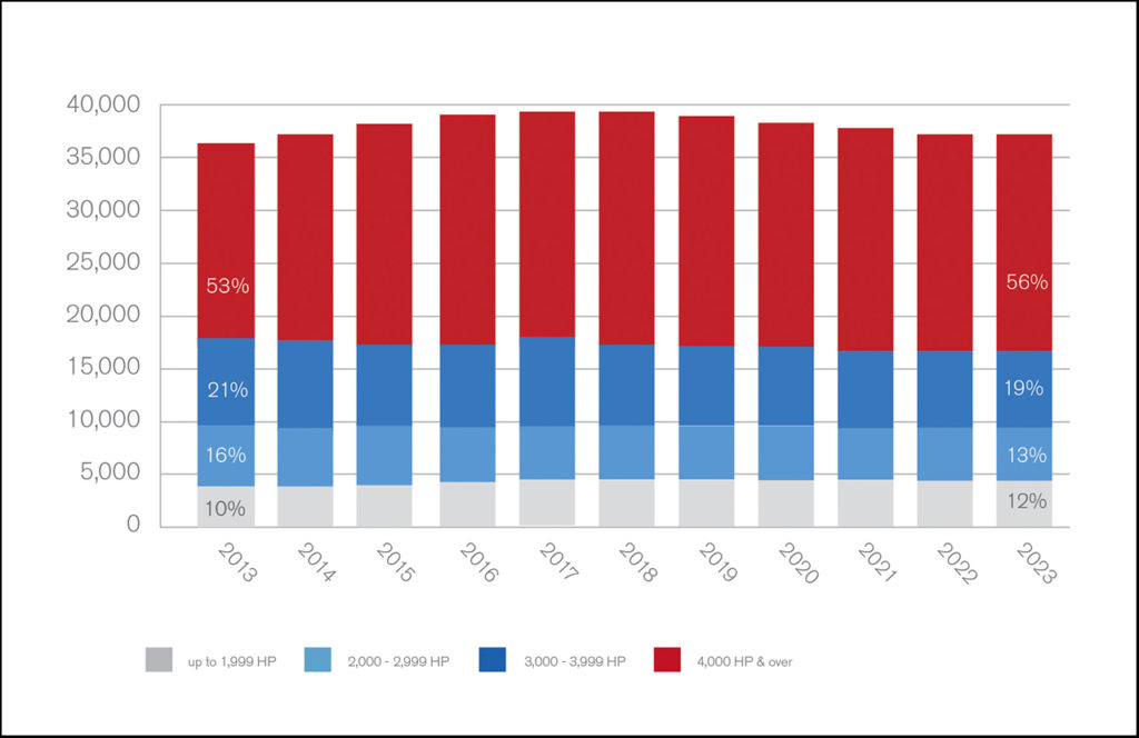 Locomotives between 2,000 and 3,999 horsepower comprised 32% in 2023, down from 37% in 2013.