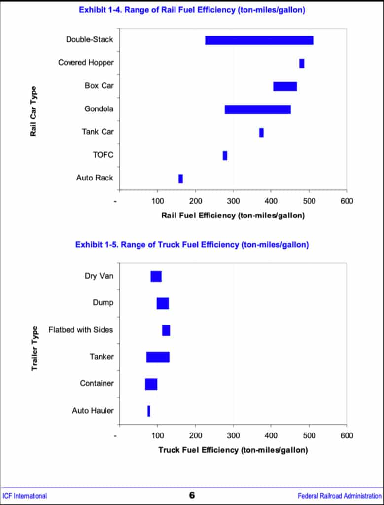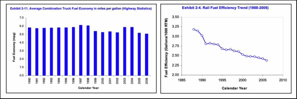 Here are two more charts from the 2009 FRA report, on the left showing average HD truck fuel efficiency 1990-2006, and on the right showing freight rail’s efficiency 1988-2006: