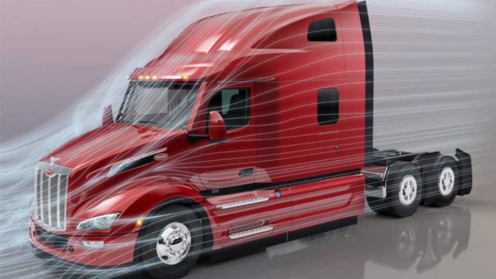 - SuperTruck 1 (2009-2016) developed 20+ technical improvements (largely to reduce aerodynamic drag) that are now incorporated into all new tractors-and-semitrailers (plus retrofits). ST1 was focused on a 50% improvement in HD efficiency (over the baseline year 2009, which happened to be 5.5 MPG). For additional details click here. Here’s an image of a HD truck with aerodynamic treatment to reduce the historic “blunt body” air resistance: