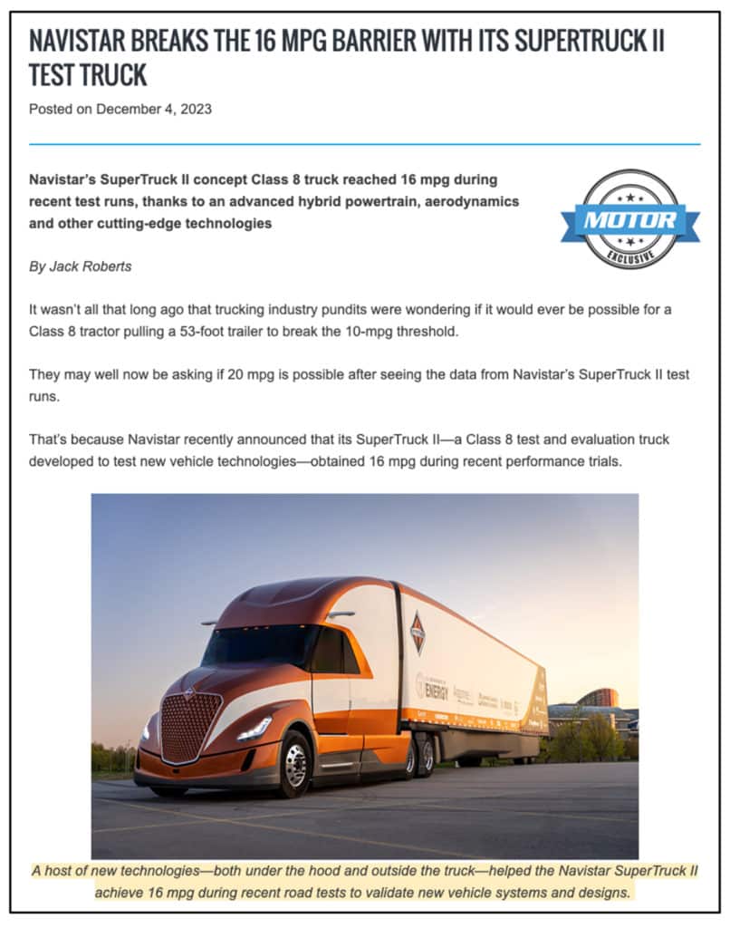 I recently received an email from Dr. Siddiq Khan (DOE’s Manager Super Truck & Lead, Rail Decarbonization) confirming that the newest HD trucks can now achieve at least 11 MPG. He also pointed out that Navistar in December 2023 demonstrated a superb 16 MPG with its “International SuperTruck II” tractor-and-semitrailer design (see the magazine excerpt below from this article):