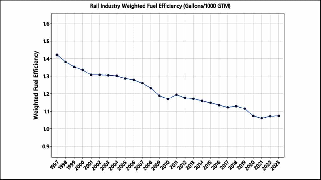 - Freight rail’s measure (reported by the railroads) is gallons of fuel per thousand gross ton-miles (Gal/1,000 GTM or G/KGTM), so any “improvement” produces a lower number over time.