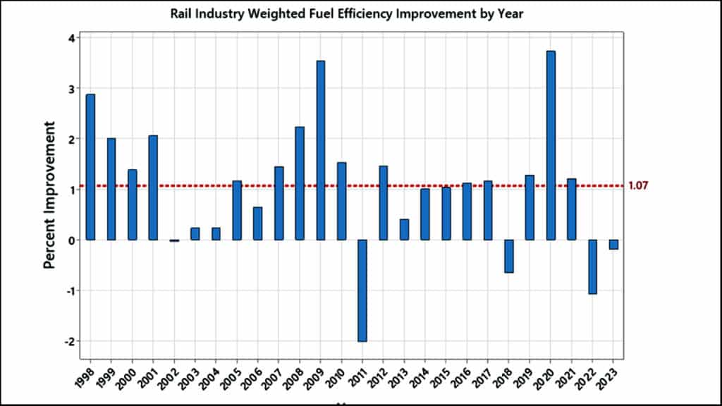 Here is Wayne’s chart showing rail’s weighted annual improvement in G/KGTM, year by year, since 1998. The long term cumulative annual improvement over the past quarter of a century has been 1.07% per year (the dashed red line) and in fact the recent annual results have “gone negative”: