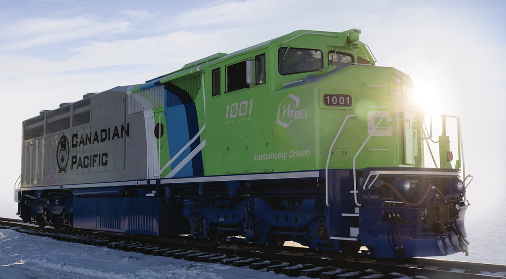 In a program originated by Canadian Pacific, CPKC’s (Canadian Pacific Kansas City) H20EL (Hydrogen Zero Emission Locomotive) prototype, now testing, is equipped with PEM fuel cells. CPKC upgraded an existing SD40-2F diesel-electric locomotive with a capacity of 3,000 hp (2,237 kW) and weighing 368,000 pounds (184 tons), with 511.5 kN STE (starting tractive effort). The diesel generator set has been removed from the locomotive and replaced with 200 kW Ballard HFC (hydrogen fuel cell) modules and battery energy storage. The HFC modules use cylinders of pressurized hydrogen gas. Bilton Welding and Manufacturing Ltd. is wrapping up work on the second of three units. The first, currently under test in line-haul service, marked a milestone in November 2022 with its first revenue move. Bilton, based in central Alberta, has provided fabrication expertise and services to CPKC since the railroad’s HFC program began in December 2020. In November 2021, CP received a $15 million 50% matching grant from Emissions Reduction Alberta (ERA) to expand the initiative to three locomotives (two line-haul units and one switcher), install hydrogen production facilities at two locations, and create a “global center of excellence in hydrogen and freight rail systems” in Alberta.