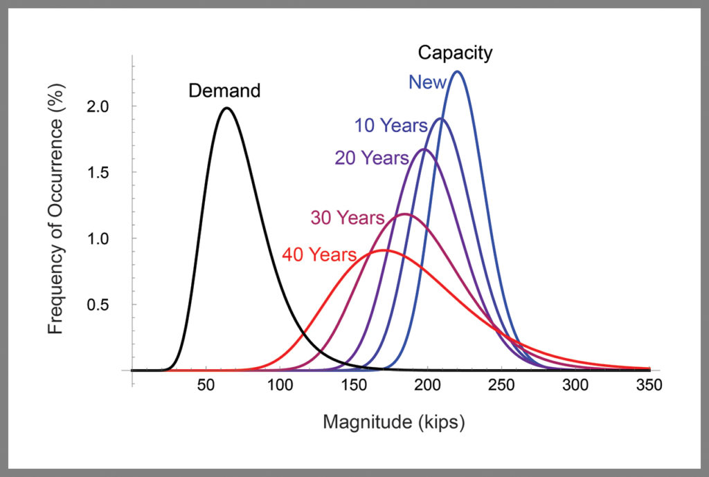 After each decade of service, we observe a slight decline in average capacity: average capacity values shift to the left. However, the average capacity value, even after 40 years, remains well above the average demand value—by a factor of more than 2.5. Of more concern is the notable increase in variability about the average: The capacity curves become wider.