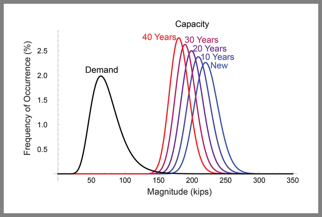 Figure 2 is a plot of frequency distributions for capacity and demand of load-bearing components in an engineered system. One demand curve is shown and is assumed representative over the 40 years of evaluation of the systems. Five capacity curves are shown representing a new system and a system after increasing years of service exposure: 10 years, 20 years, 30 years and 40 years.