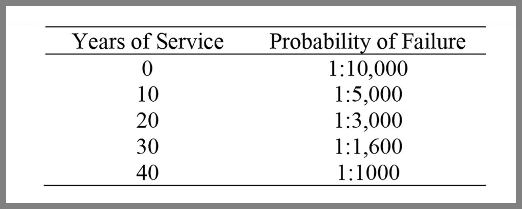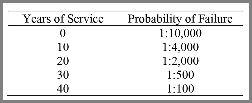 Now, let’s look at what has happened to the probability of failure of these systems after each decade. Table 1 lists the probabilities of failure for each of the five capacity curves. When the systems are new, the probability of failure is roughly 1 in 10,000. After 40 years, the probability of failure has increased to 1%, that is, by a factor of 100.