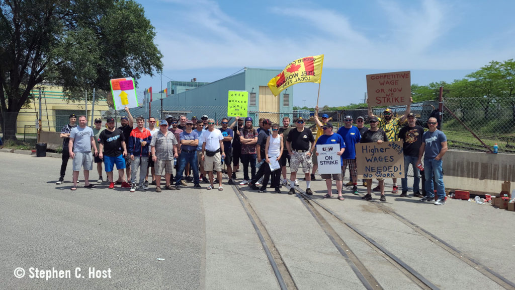 Striking United Steelworkers Local 7135 members picket in front of National Steel Car’s plant entrance. Stephen C. Host photo.