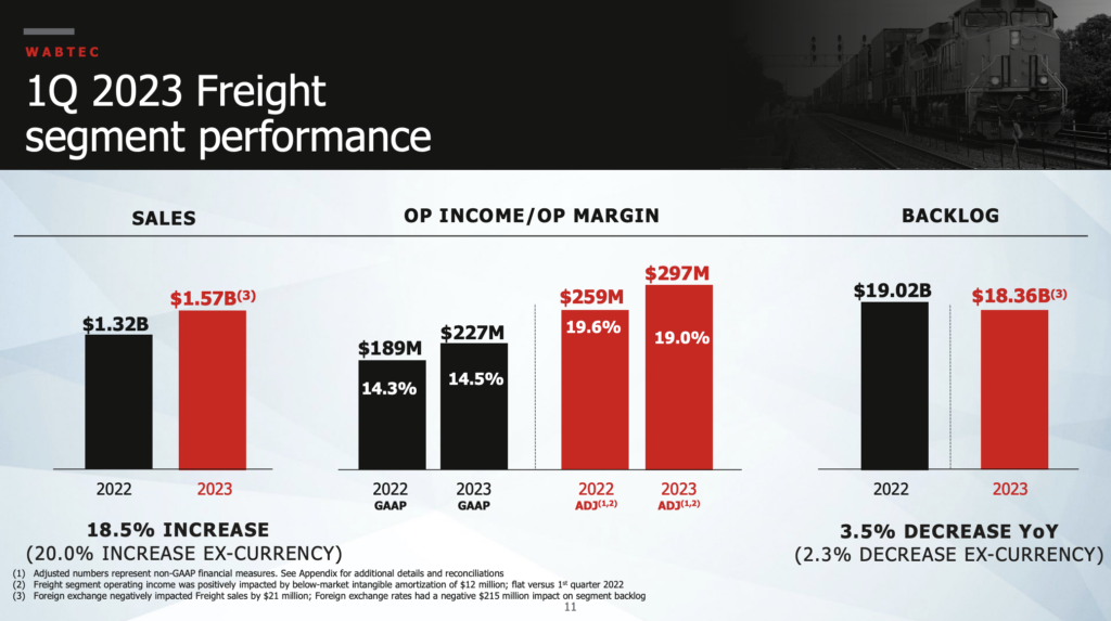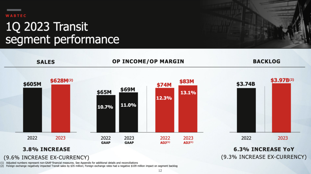 For first-quarter 2023, Transit segment sales were up “due to strong aftermarket sales partially offset by unfavorable foreign currency exchange.” On a constant currency basis, Transit segment sales were up 9.6%. GAAP and adjusted operating margins were up “as a result of higher sales and Integration 2.0 savings,” Wabtec reported.