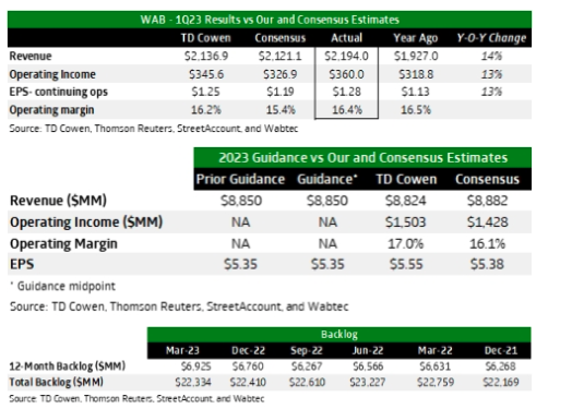“Wabtec reported a top-to-bottom beat to our and consensus estimates,” reported TD Cowen OEM Transportation Analyst Matt Elkott. “It maintained FY23 guidance despite macro uncertainty, and management noted that underlying business fundamentals strengthened in the first quarter despite a challenging environment.”