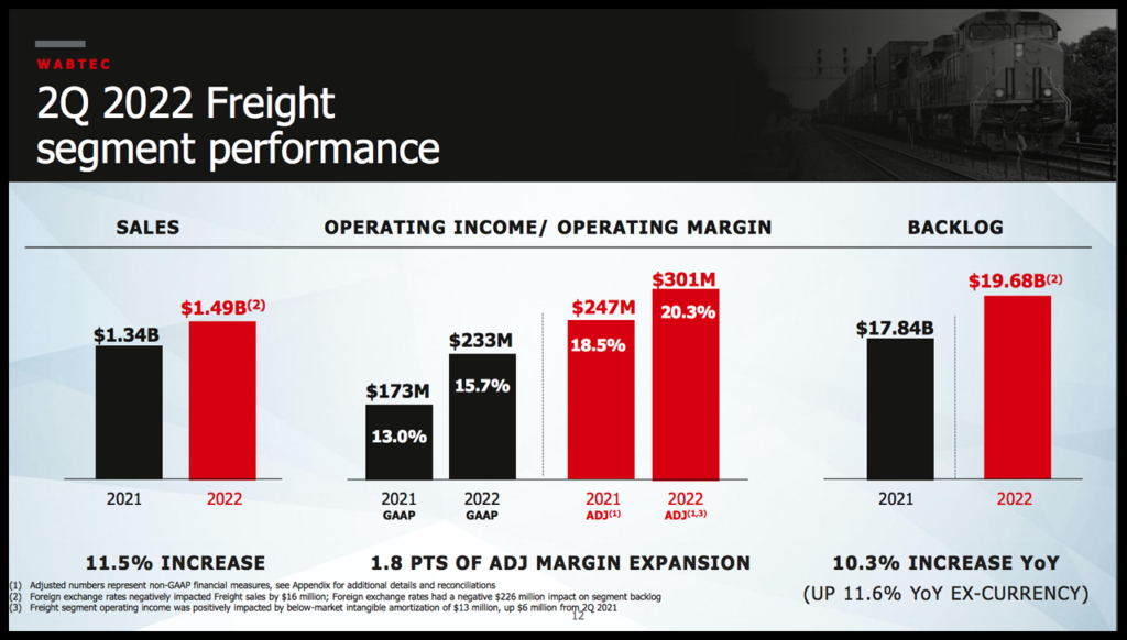 For the three months ended June 30, 2022, Wabtec GAAP earnings per diluted share of $0.91 rose 37.9% from the prior-year period’s $0.66; adjusted, they were $1.23, up 16.0% from $1.06. This was “primarily due to higher sales and increased operating margins,” Wabtec said. “GAAP EPS further benefited from lower restructuring and transaction costs.”
