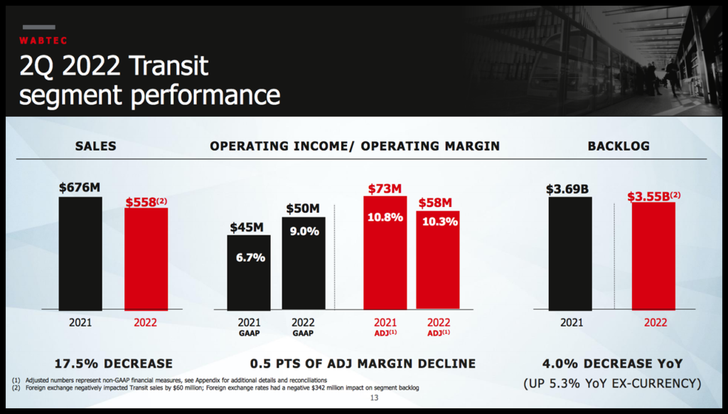 Transit segment sales for second-quarter 2022 came in at $558 million, down 17.5% from the prior-year period. The company said this was “primarily due to unfavorable foreign currency exchange and supply chain disruptions.” It added that “GAAP operating margin was up significantly as a result of lower restructuring and transaction costs, while adjusted operating margin was down modestly as a result of increased input costs and lower fixed cost absorption.”