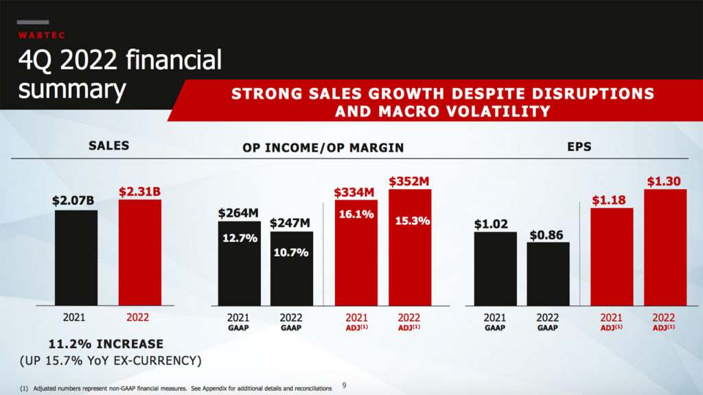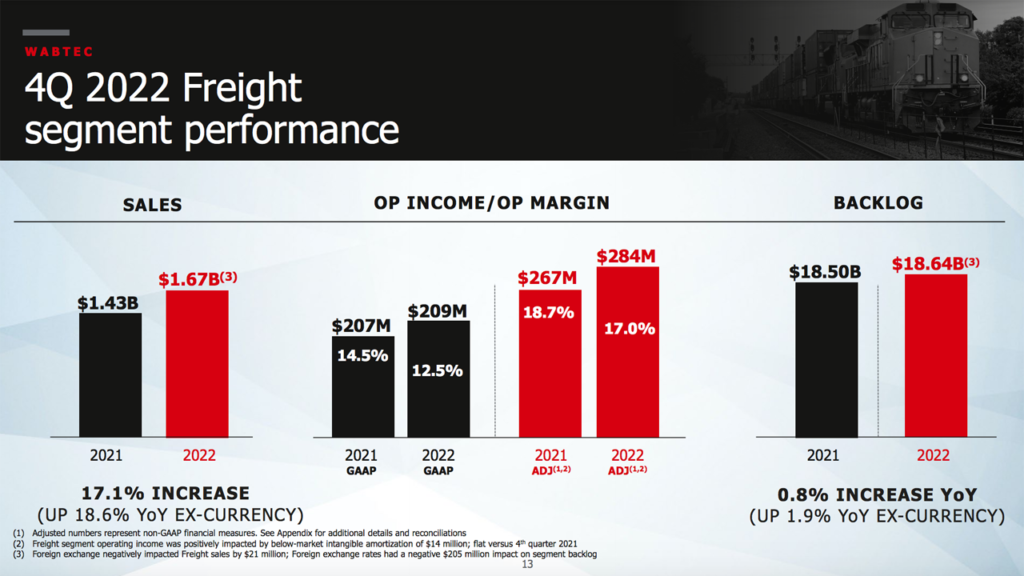 GAAP operating margin for fourth-quarter 2022 was down 2.0 percentage points, which Wabtec attributed to “higher restructuring costs.” Adjusted operating margin was lower, it said, “due to unfavorable sales mix and increased technology spend in the quarter.”