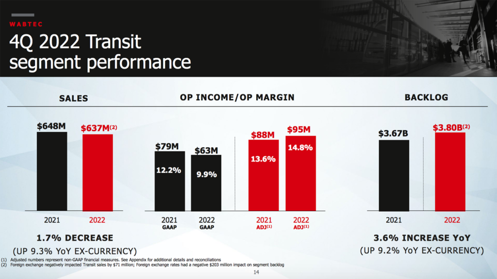 Transit segment sales for fourth-quarter 2022 came in at $637 million, a 1.7% decrease from the $648 million posted in the same quarter in 2021. Wabtec attributed this to “unfavorable foreign currency exchange.” It noted that on a constant currency basis, sales were up 9.3%. Additionally, GAAP operating margin was down “as a result of higher restructuring costs, while adjusted operating margin benefited from increased productivity and a strong cost discipline,” according to the company.