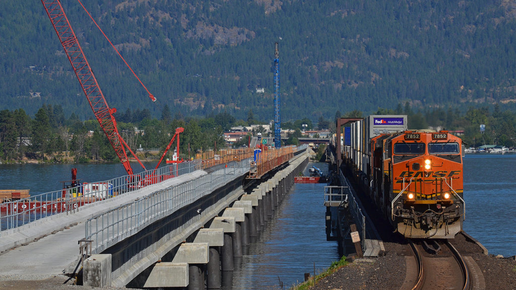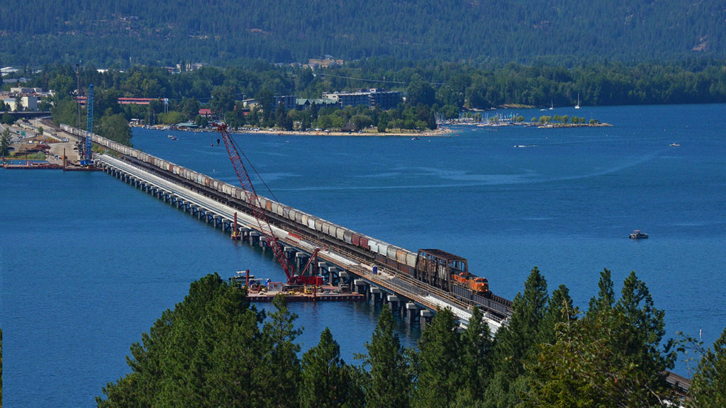 Since 2008, BNSF has performed upgrades to its existing bridge over Lake Pend Oreille, installing new piers and deck girders as needed. The second bridge over Lake Pend Oreille, started in March 2020, will allow that process to continue with less interference to train traffic. BNSF says it “has identified maintenance work to occur [on the existing bridge] once the new bridge is operational, estimated for 2023-2024.”