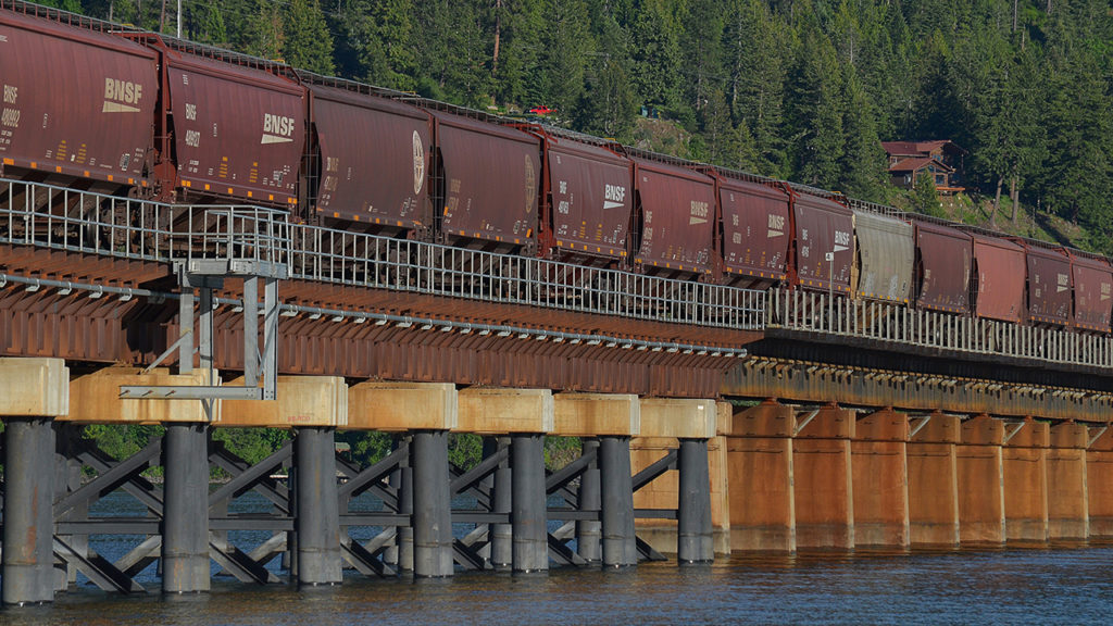 BN made basic improvements to The Funnel’s capacity during the 1970s and ’80s by lengthening sidings or creating short segments of double track. After BN merged with Santa Fe to become BNSF, major doubletracking projects on The Funnel were completed in 1998 and 2017, leaving just two short sections of single-track main: the two miles between East Algoma and Sandpoint Junction, and approximately four miles between Otis Orchards and Irvin, Wash. Initial fill and grade work for the Otis Orchards-Irvin second main was done in 2020, but BNSF won’t begin major work there—which will include a second bridge over the Spokane River—until some time after the Sandpoint project is completed.