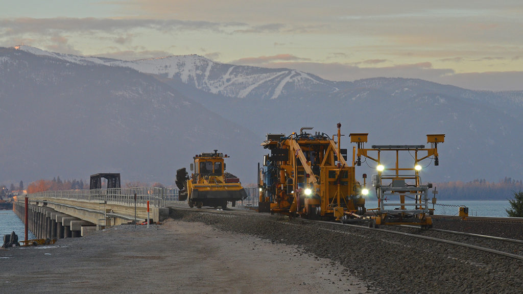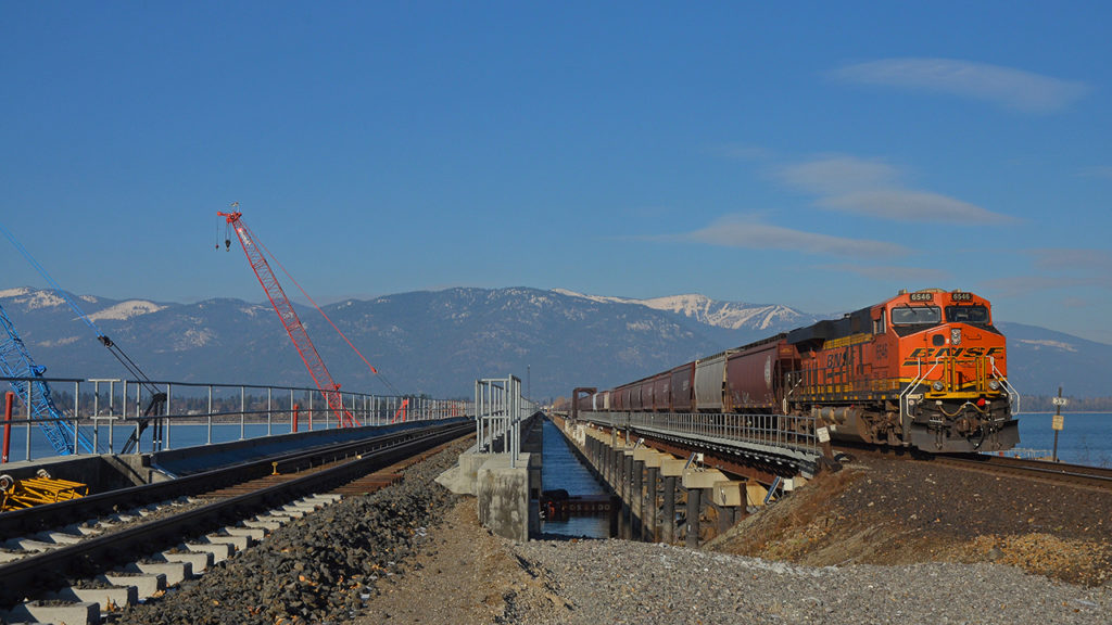 While improvements are being made to the older bridge over Lake Pend Oreille, BNSF will continue site preparation for a second main track that will run approximately one mile from the new bridge to Sandpoint Junction, where BNSF connects with Montana Rail Link. The historic Northern Pacific depot in Sandpoint, which serves as Amtrak’s only passenger stop in the entire state of Idaho, will see its platform reconfigured to make room for the second main track. After all bridge and track work is completed in Sandpoint, BNSF will have roughly 53 miles of double-track main line from there to Otis Orchards, Wash., on the eastern edge of Spokane.