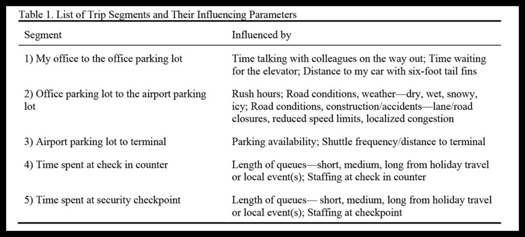 Imagine that I have a flight to catch. When do I need to leave the office so that I arrive at the boarding gate on time? This is a problem many of us have encountered and usually solve successfully. But how often have we considered this to be a basic exercise in predictive analytics? Suppose we create a model that is an ordered list of the trip segments that largely determine the time of our trip to the gate (the logic of the model) and an estimate for the duration of each segment. For example, Table 1 (above) contains a list of those trip segments and the parameters that might influence the duration of each segment.