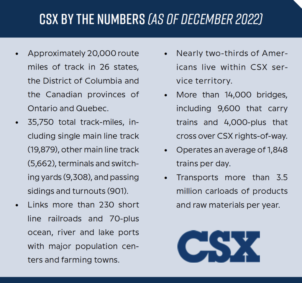 Johnson: The Howard Street Tunnel project is going to be a huge win not only for our company but also for the Port of Baltimore and for the surrounding states. (Editor’s Note: The $466 million project will reconstruct CSX’s almost 130-year-old, 1.7-mile-long freight rail tunnel to accommodate double-stack container trains to and from the Port of Baltimore. It consists of vertical clearance improvements at the tunnel and 21 other locations between Baltimore and Philadelphia. The Howard Street Tunnel will be reconstructed to provide an additional 18 inches of clearance. Three additional bridges in Baltimore also will require superstructure work: the North Avenue bridge will be modified and the Guilford Avenue and Harford Road bridges will be replaced. Other locations in Maryland, Delaware and Pennsylvania will require track lowering beneath the structures. STV and Michael Baker International are providing pre-construction services.) Next year—probably in the second quarter—we’ll get our clearance going north out of Baltimore. The Howard Street Tunnel project is going to take us a couple of years to complete, but we’re progressing on it. We’re really focused on it. As we go into 2024 and 2025, it will be a huge project to get clearance through Baltimore and in other directions. The other big projects involve siding capacity on our Chicago-Jacksonville and New Orleans-Southeast corridors. They’re 75% to 80% complete, and we expected to be done in first-half 2024. We’ve completed and are proud of a new connection on our Brunswick Subdivision—1,500 feet of track and two switches at Nahunta, Ga. Previously, trains originating in Waycross, Ga., going toward Savannah on our Jesup Subdivision were restricted to single track with limited siding space for meets and passes. The Jesup Subdivision connects with the Nahunta Subdivision on our I-95 route or A Line, at Jesup, Ga. The Brunswick Subdivision crosses the Nahunta Subdivision at Nahunta, Ga. Since the Brunswick Sub is routed in the same direction from Waycross to Savannah as the Jesup Sub, building a connection from the Brunswick Sub to the Nahunta Subdivision toward Savannah at Nahunta basically created 30 miles of double track. Now, instead of holding a train headed to Waycross at Jesup for one coming from there, we can run directionally for 30 miles on the three subdivisions. It has really improved our fluidity in the area. No delays from holding trains to meet and pass has been a tremendous improvement for a relatively small investment. Also, when you think about the Chicago-Jacksonville corridor and the traffic we interchange in New Orleans that’s routed through Montgomery headed to Waycross, by adding capacity and increasing siding lengths—which previously averaged 6,000 feet—we now have two routes into Waycross from Birmingham: When traffic from Chicago gets to Birmingham, we can now run through Montgomery, Dothan [Ala.] and Thomasville [Ga.] on the Dothan and Thomasville subdivisions into Waycross, or we can run on our Lineville and Fitzgerald subdivisions [through Manchester, Ga.], a very dense corridor that can get constrained. These two possible routings between Jacksonville and Birmingham through Waycross add capacity to that whole corridor. We’re excited about that. It improves our ability to handle existing business, but also unlocks the growth opportunity for all our customers and in that corridor.