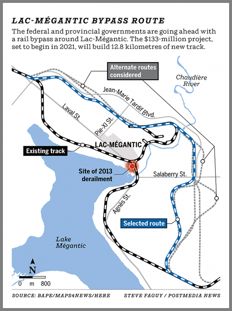 The rail bypass project requires Canadian Transportation Agency approval in accordance with Section 98 of the Canada Transportation Act. An application for approval has been filed. The chosen route “will ensure that trains leave downtown Lac-Mégantic for good,” said Transport Canada. “This route was recognized as the most advantageous one by the Quebec BAPE (Bureau d’audiences publiques sur l’environnement) in 2019 and as the one with the least impact on agricultural land by the PTAQC (Commission de protection du territoire agricole du Québec) in 2020. Since the 2013 tragedy, Transport Canada has considerably strengthened its oversight program and has put in place stricter measures and requirements to protect communities that live along rail lines through regulatory and legislative reform.”