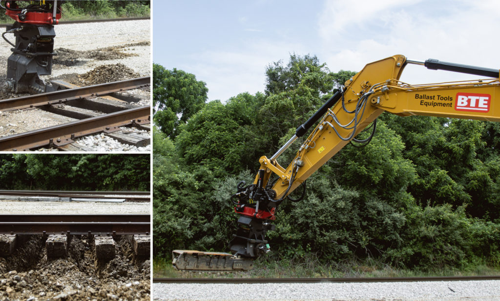 The introduction of the BTE CRIBBER, BTE says, now allows railways to utilize a single operator and a BTE Hi-Rail Excavator outfitted with a bucket, CRIBBER, dump cart and tamping attachment to completely remediate FRA fouled ballast defects. The BTE’s Fouled Ballast Solution requires fewer machines and personnel, as well as less track time, according to the company.
