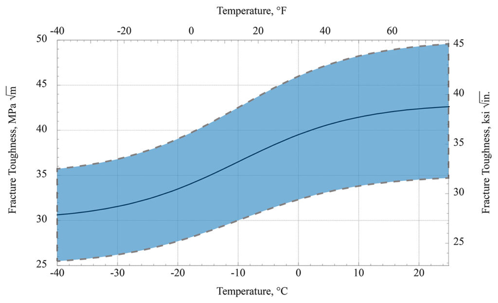 To address this problem, we need to understand steel material behavior. Most metals, including steel, have a material property called “fracture toughness.” Fracture toughness is a measure of the ability of the metal to sustain load, without fracturing, in the presence of planar defects, such as fatigue defects. Under a given load, the larger the value of fracture toughness, the larger a fatigue defect can be before causing the steel to fracture.