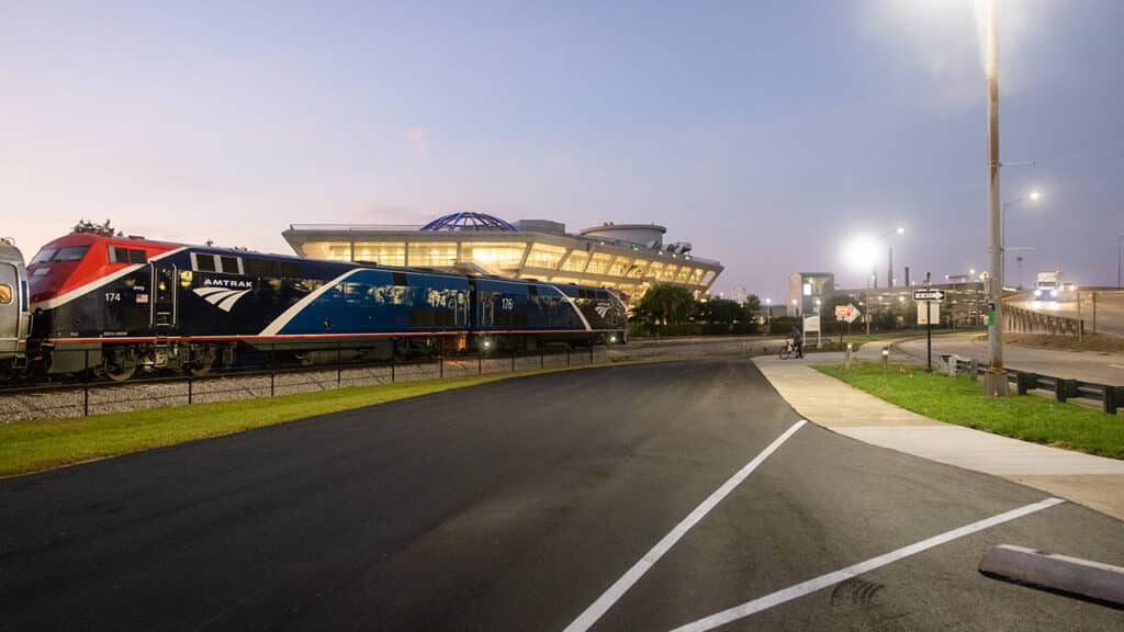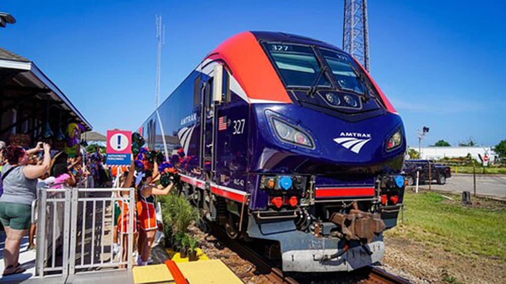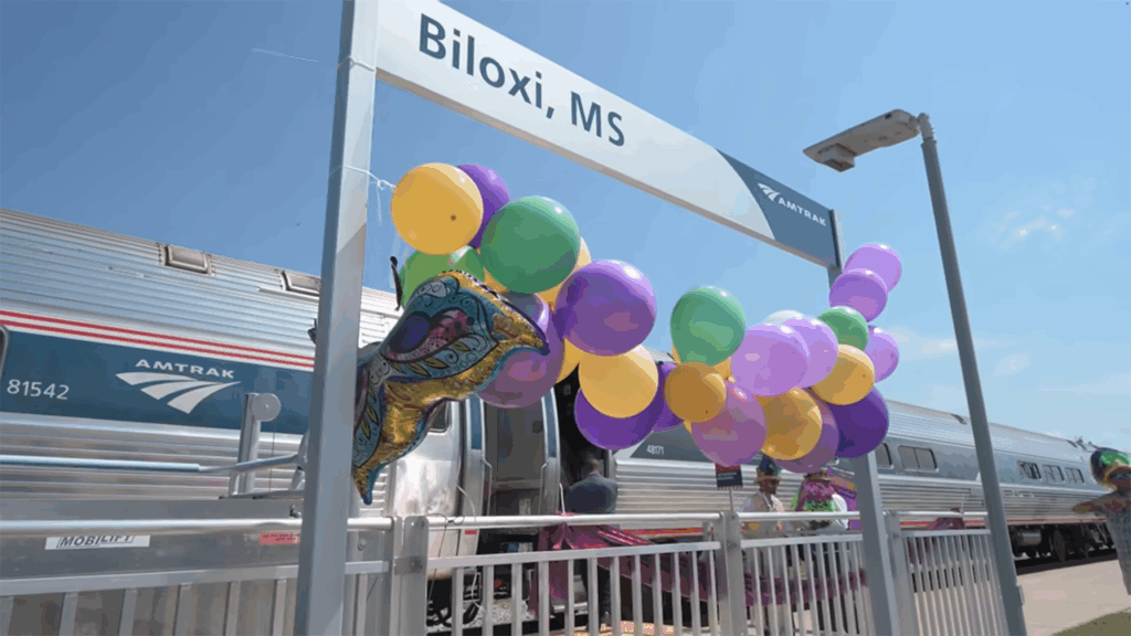 There are two round trips per day on Mardi Gras Service between the Crescent City and Mobile, Ala., with intermediate stops at four locations along the Mississippi Gulf Coast: Bay St. Louis, Gulfport, Biloxi, and Pascagoula. Getting those trains onto the rails required an effort spanning nearly two decades, representing the time since the Gulf Coast segment of the Sunset Limited between New Orleans and Florida was discontinued in the wake of Hurricane Katrina, which devastated New Orleans and the Mississippi Gulf Coast in 2005. The storm knocked out all Amtrak service in the region, but the trains to New York, Chicago and Los Angeles came back. Trains east of the New Orleans did not until now, as Amtrak’s new Mardi Gras Service made its debut. The new trains bring rail passenger service back to the region less than two weeks short of two decades since the last scheduled trains ran along the line, on a tri-weekly schedule at that time.