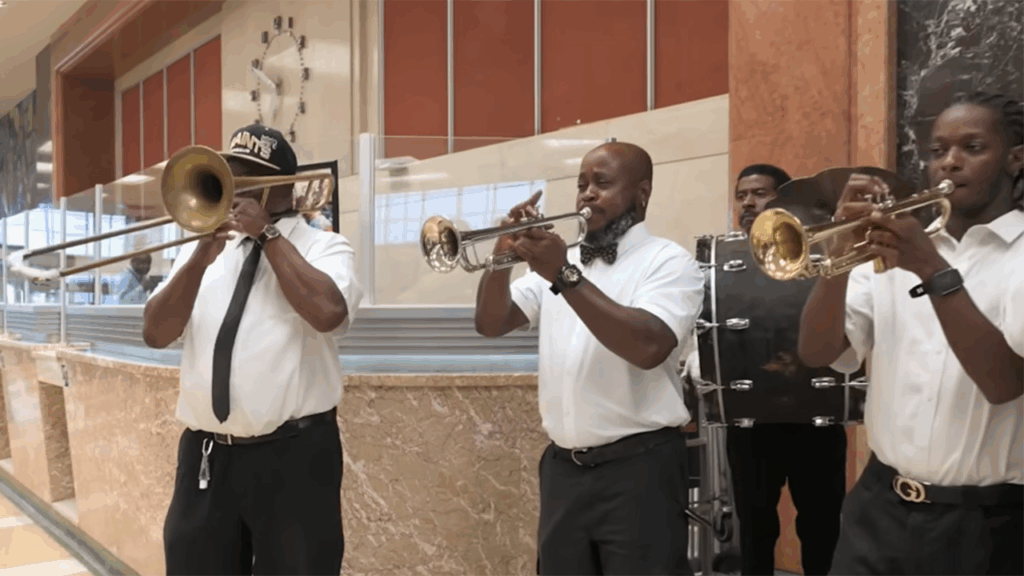 The day’s activities began at the Union Passenger Terminal in New Orleans about 6:45 AM, to allow plenty of time for boarding before the 8:00 departure. Everyone present was serenaded by the Stooges Brass Band, in the New Orleans tradition. Officials from the City, the FRA, and Amtrak made statements. So did elected officials, including local members of Congress and Mississippi Republican Sen. Roger Wicker, who was one of the major players in the effort to get the trains going. In the Mardi Gras tradition, leaders of two krewes (clubs that participate in planning and executing parades and other Carnival festivities and are involved in other civic activity) spoke officially. Leaders of the Krewe of Rex (founded in 1872) and the Zulu Social Aid & Pleasure Club (predecessor founded in 1909; Louis Armstrong was “King of the Zulus” for the 1949 celebration) proclaimed good wishes for the new train service before the band led the march out the door and onto the platform, followed by the riders in the “second line” as they prepared to board.