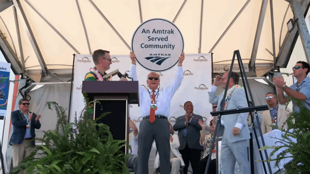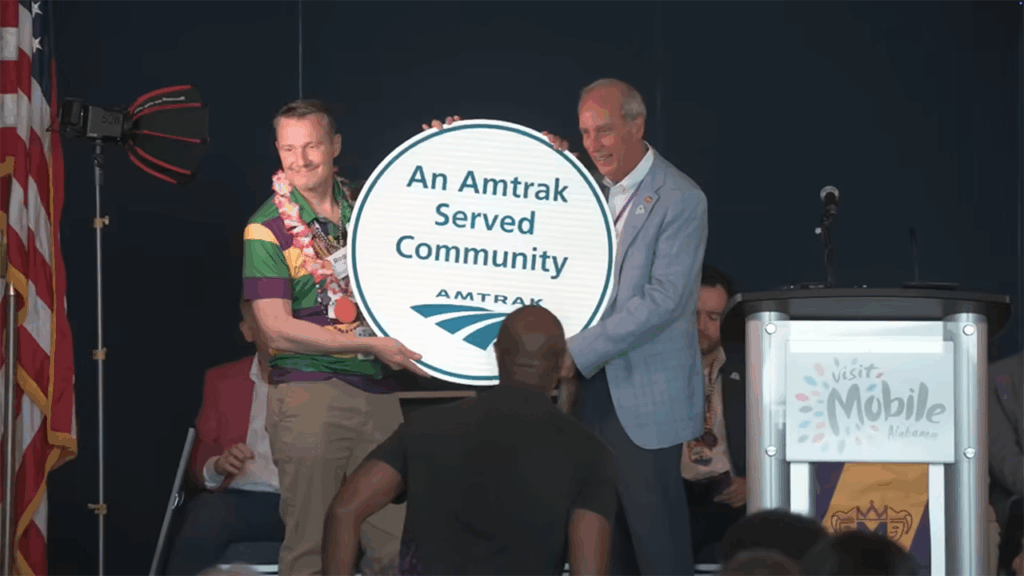 At all four stops in Mississippi, well-wishers, perhaps as many as a thousand or two, showed up at the stations to see the train and greet it as it stopped and listen to music from local bands and speeches by mayors and other officials. Many members of the crowd were decked out in outfits showing the Mardi Gras colors of green, gold and purple. Amtrak President Roger Harris also wore a shirt that sported those colors, and received a number of favorable comments for doing so. The celebrations along the route began before the train came through, and continued after it left. Sen. Wicker made six speeches, the final being at a reception at the Mobile Convention Center. At each stop, Harris presented the mayors, who also made remarks, with a round sign that bore the Amtrak logo and the words “An Amtrak-Served Community.” Effective now, those communities fit that description.