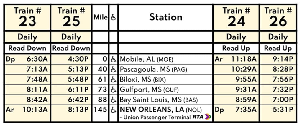 The trip began at 8:00 AM and proceeded through the terminal track and the NS Back Belt (historically Southern Railway) to Gentilly Yard in the Crescent City, also part of the route on Trains 19 and 20 from and to New York. After that, the rest of the route was on the New Orleans & Mobile (NO&M), formerly part of the Louisville & Nashville Railroad (L&N) and now part of CSX. Scheduled running time for the route is 3 hours and 25 minutes, end to end, although the inaugural run did not meet that schedule. Revenue service runs are Train 23 from Mobile at 6:30 AM; Train 24 from New Orleans at 7:35 AM; Train 25 from Mobile at 4:30 PM; and Train 26 from New Orleans at 5:31 PM.