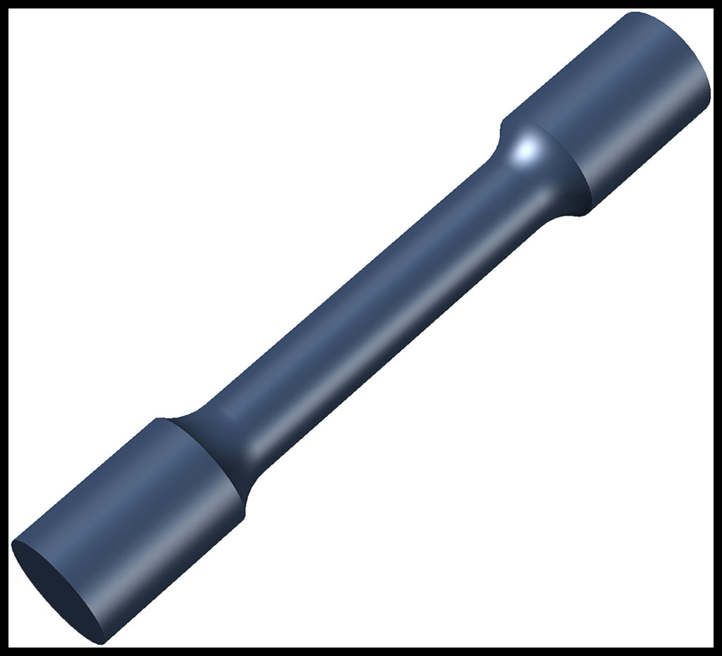 We are now ready to introduce the concept of material strength. The strength of a material is usually defined simply as the maximum stress that can be applied to the material before the material fails. Therefore, strength has the same units as stress—for example, psi. To establish its strength, controlled tests are performed on samples of a material. Figure 3 is a drawing of a standard “tensile test” specimen used to establish the strength of ductile metals. The specimen is usually five inches long and half an inch in diameter along its midsection. In this test, the ends of the specimen are gripped and pulled by a machine until the specimen breaks in two. The load applied to the specimen and the elongation of the specimen are recorded continuously during the test. After the test is complete, the load and elongation data sets are used to calculate the strength of the material.