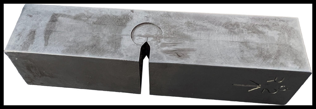 Figure 4 is a photograph of a test specimen used to establish toughness values for steel. The specimen includes a sharp, machined notch. The test is conducted in two stages. First, the specimen is subjected to a cyclic load to initiate and grow a fatigue crack from the notch. Then, the specimen is subjected to an increasing load until the specimen fractures. Several specimens from a given material are tested at different temperatures to establish the sensitivity of the material to cracks over its expected range of operating temperatures. Data sets recorded during each test are used to calculate a quantity called Fracture Toughness, which is directly related to Material Toughness but reflects the relationship among Material Toughness, applied stress and fatigue crack size.