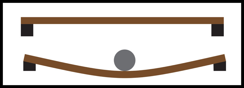 Let’s start with stress and strain. Figure 2 shows drawings of a beam that is supported by blocks at each end. In Figure 2-a, the beam is not loaded. In Figure 2-b, the beam bends under a load applied at its center, and its supports also deform. The bend in the beam and deformation of its supports are measurable on a global scale. Less obvious is what happens inside the materials used to make the beam and its supports—internal forces and internal deformations. One should imagine these two effects occurring at the atomic scale; atomic lattices of materials deform as interatomic bonds work to resist these internal forces. This is generally where the engineering concepts of stress and strain apply—within materials at an infinitesimal scale. Consequently, stress and strain are termed differential quantities.