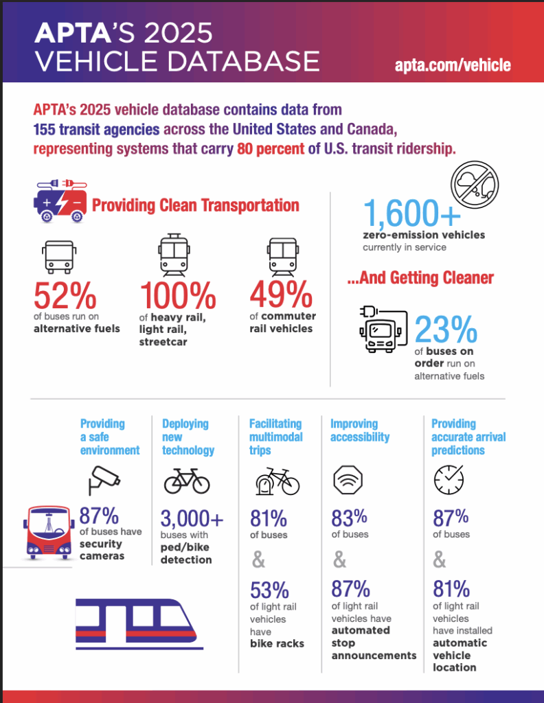 “APTA’s Public Transportation Vehicle Database is an indispensable tool for understanding the current state and future direction of our nation’s transit fleets,” said APTA President and CEO Paul P. Skoutelas. “Through this resource, we’re equipping policymakers, including Members of Congress and their staffs, with the data they need to make informed decisions about critical public transportation infrastructure and funding needs.”