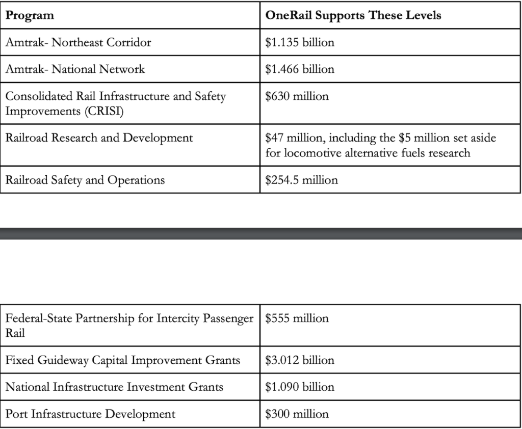 The letters, which include a table listing (pictured above) of the programs OneRail wants to see funded and at what amount, also encourage lawmakers to support increased funding for grade crossing safety efforts and reject efforts to increase federal truck weight or length limitations.