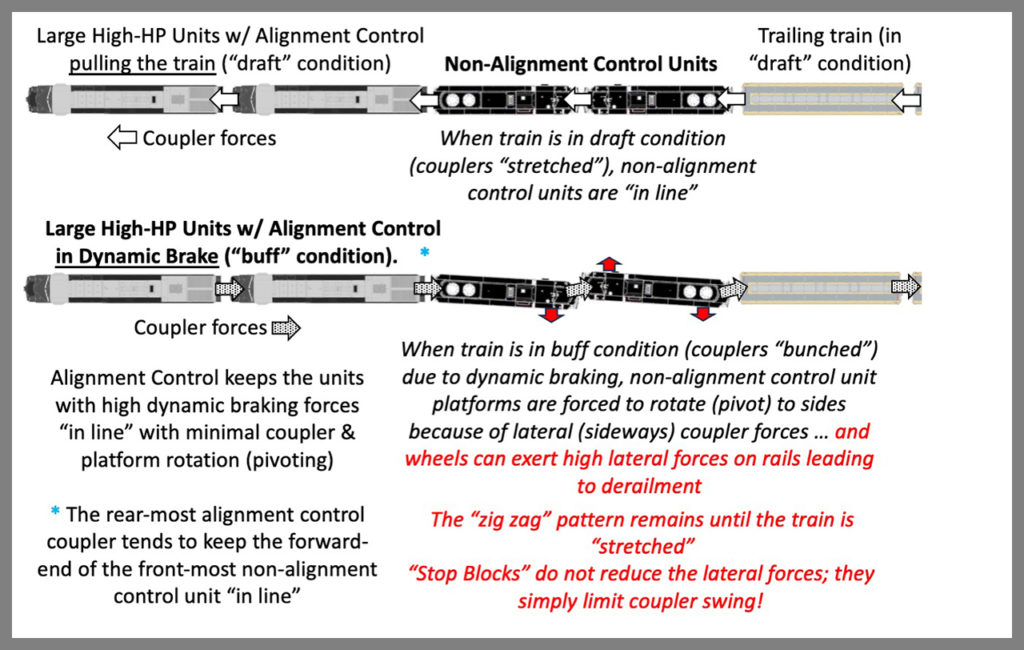 These derailments typically involve one or more large, high-horsepower locomotives equipped with alignment control operating in dynamic braking, followed by one or more shorter locomotives, typically 4-axle commuter/passenger, road-switcher or switcher units, either working, isolated or shut down, and not equipped with alignment control couplers and draft gear. There is a freight train behind the non-alignment control locomotives.