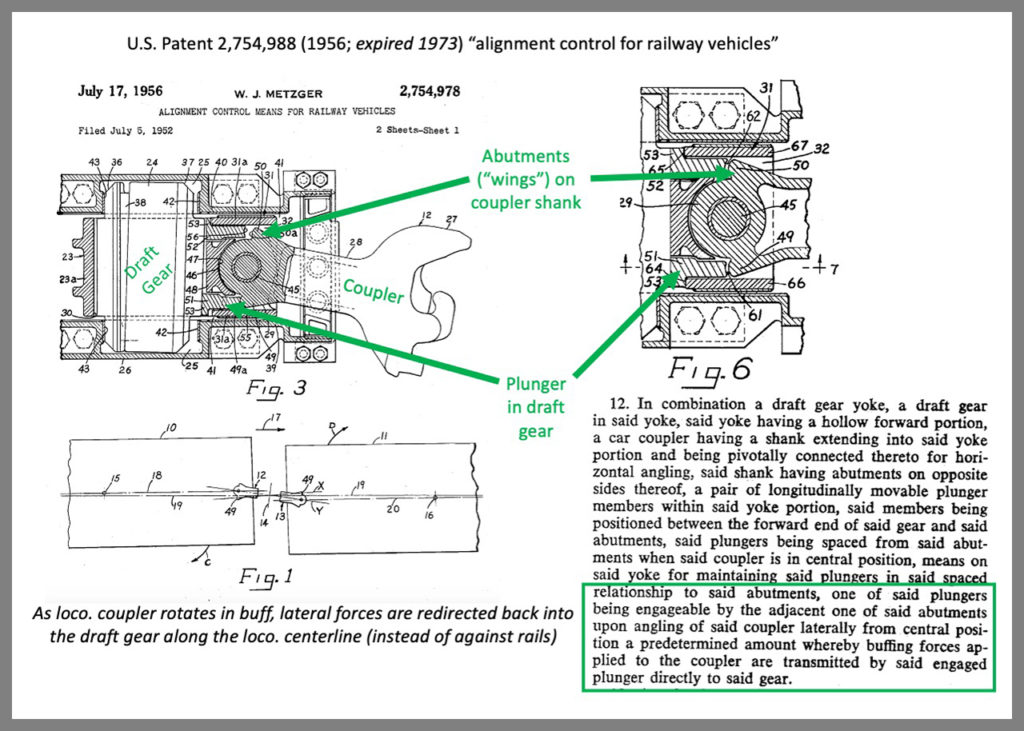 All that said, what should be defined as “alignment control couplers and draft gear”? The answer can be found in U.S. patent 2,754,988 issued to William Metzger in 1956 (Figure 2) and assigned to a predecessor of the former National Castings. Expiration of the patent in 1973 has allowed several suppliers to produce and sell interchangeable alignment control couplers and draft gear for locomotives: