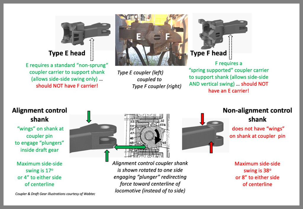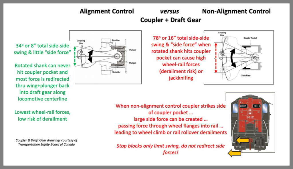 Figure 5 goes to the heart of what alignment control does. The left drawing shows a Type E alignment control coupler with an alignment control draft gear; note it can only swing 4 inches (or 17 degrees) to either side of the centerline. The right drawing shows a Type E non-alignment control coupler and a non-alignment control draft gear; note it can swing as much as 8 inches (or 34 degrees) to either side of the centerline, with the shank striking the coupler pocket at maximum swing. Both diagrams are in the three TSB reports from Canada (R02C0050, R05C0082 and R10T0056):