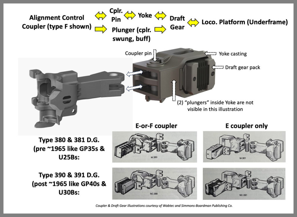 Figure 3 also shows the shank of an alignment control coupler (left) compared to a non-alignment control coupler (right). Note the “wings” on the alignment control shank, and look back to the patent drawing in Figure 2. My thanks to Wabtec for allowing me to use some of their coupler and draft gear illustrations.