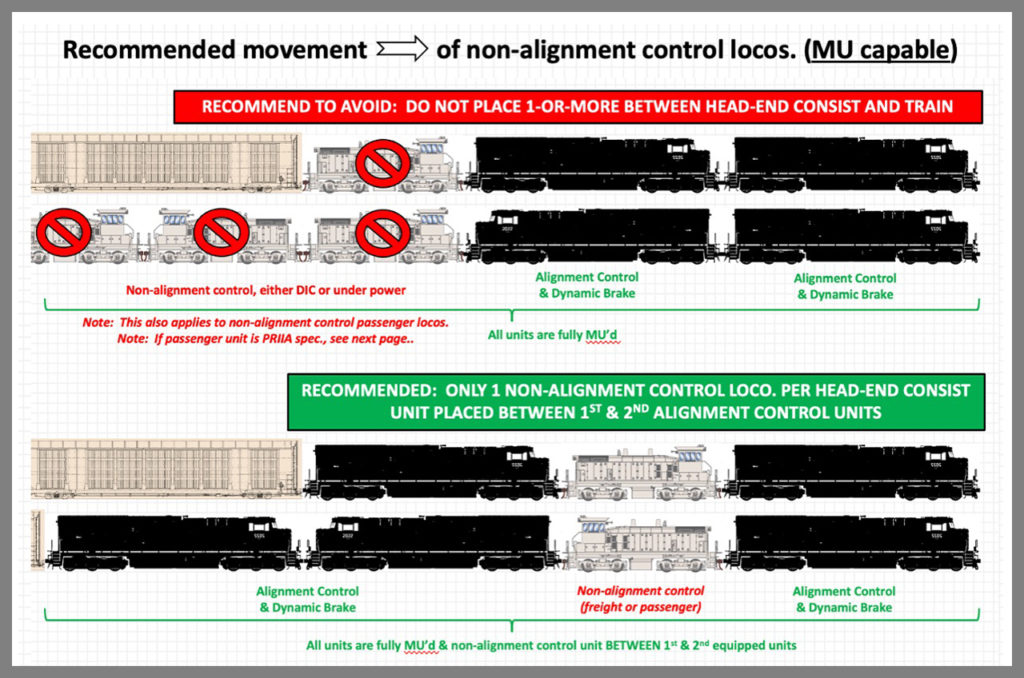 What I’m proposing, shown in Figure 6, is that only one non-alignment control locomotive be moved per train, coupled between two high-horsepower units equipped with alignment control (the bottom configuration), provided the older units have full multiple-unit capability. Putting any non-alignment control locos between the high-horsepower locomotives and the train (the top configuration) should always be avoided. If the older unit lacks multiple-unit capability, the only option would be to place it at the extreme rear end: